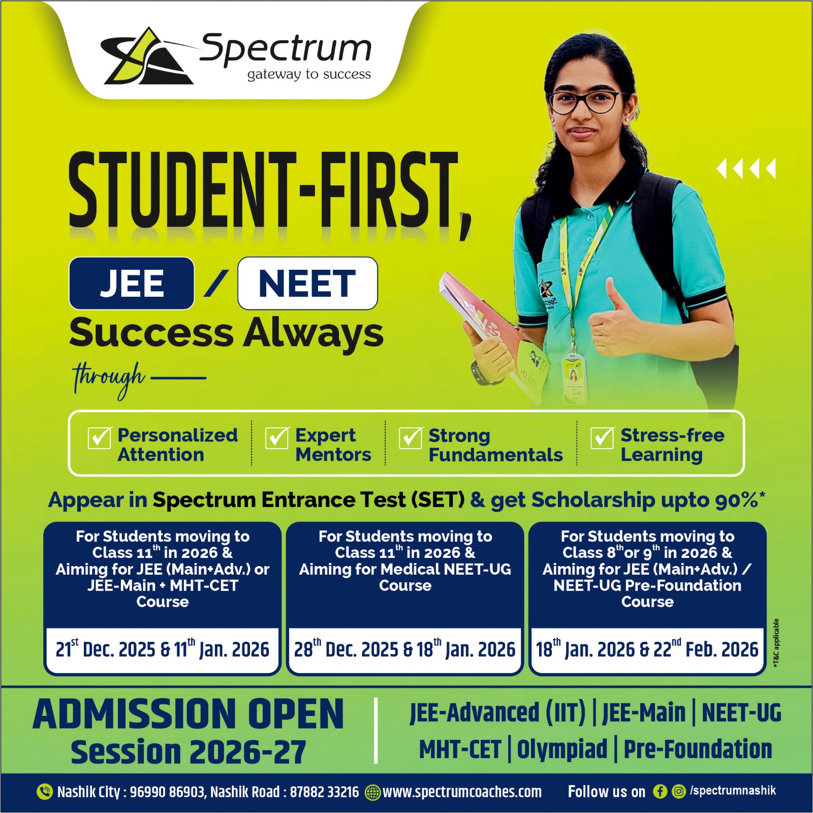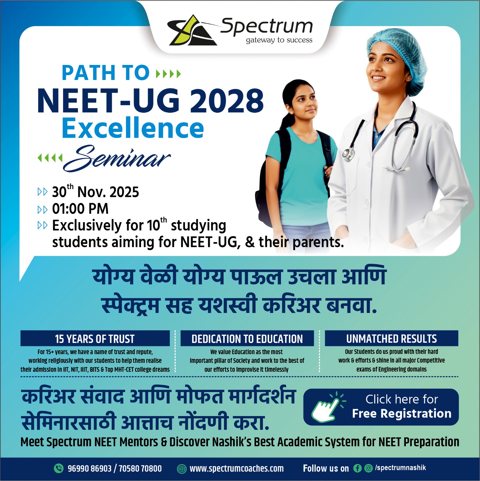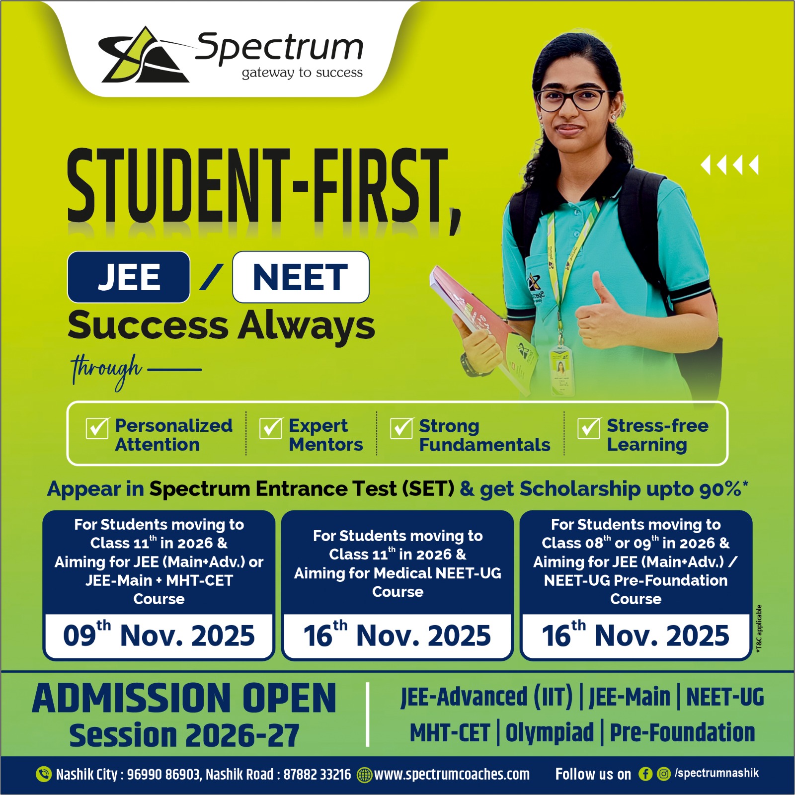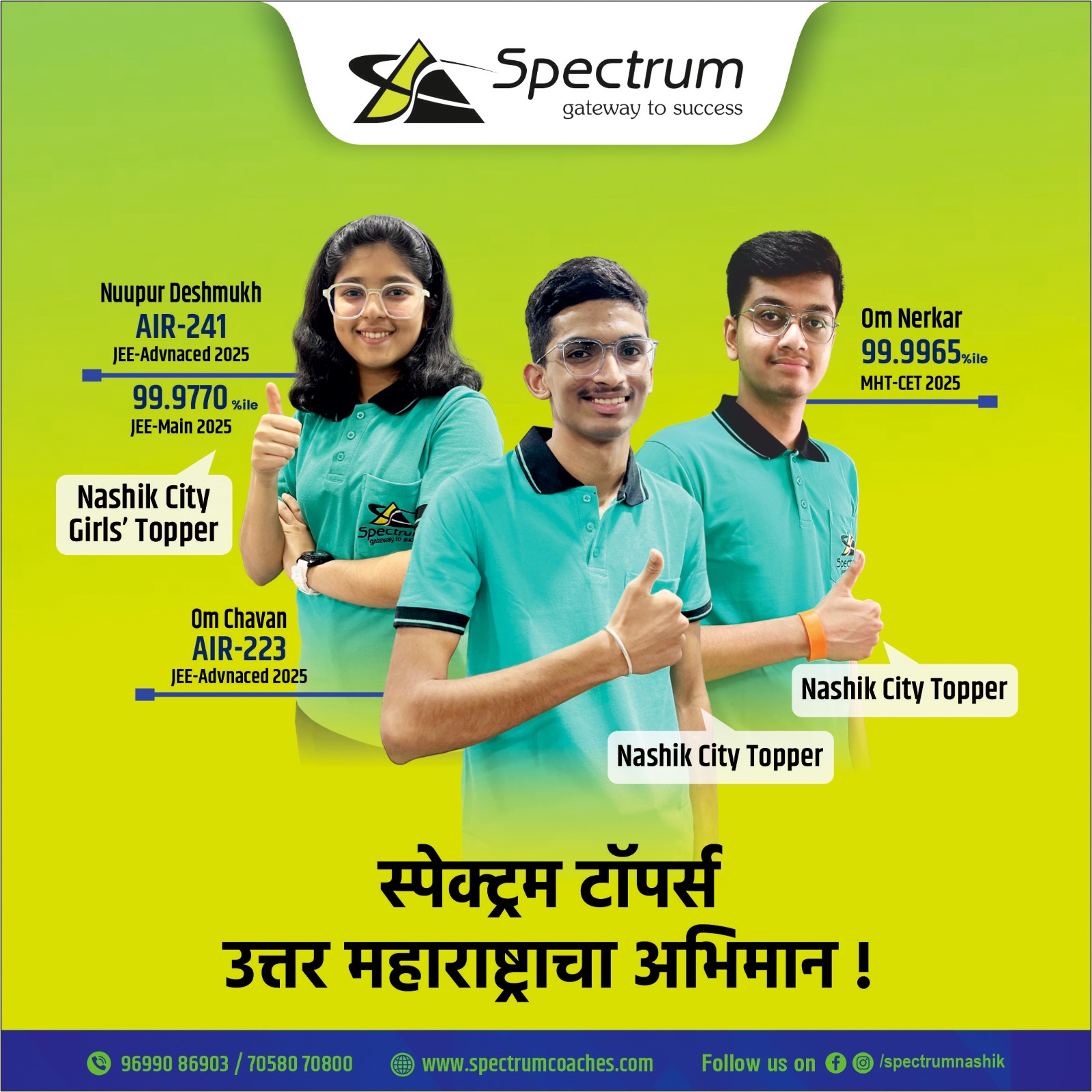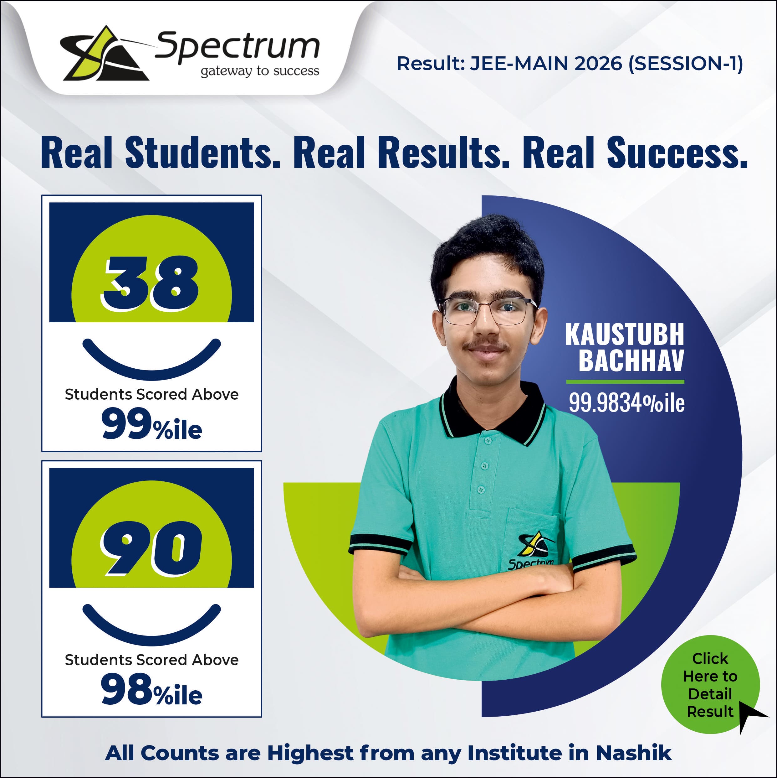 The devotion and expertise of our teachers and the methodologies followed by them have generated a confidence amongst the students and parents, due to which Spectrum is regarded as a premier coaching institute for IIT-JEE (Advanced), JEE-Main, NEET-UG, BITSAT, MHT-CET & Olympiads preparation at Nashik.