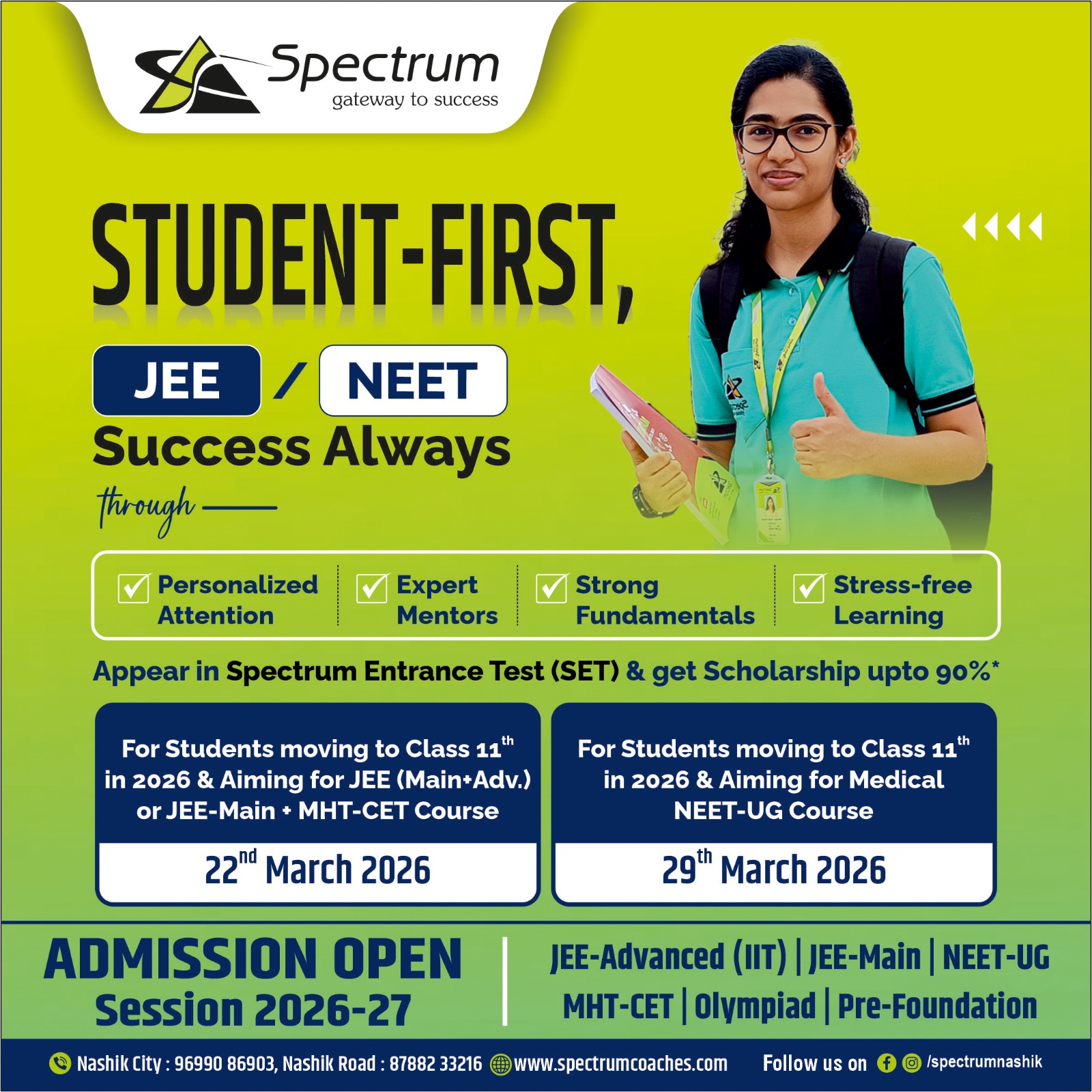 The devotion and expertise of our teachers and the methodologies followed by them have generated a confidence amongst the students and parents, due to which Spectrum is regarded as a premier coaching institute for IIT-JEE (Advanced), JEE-Main, NEET-UG, BITSAT, MHT-CET & Olympiads preparation at Nashik.